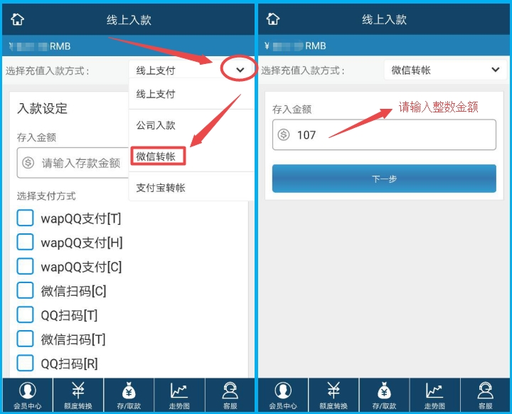 登入账号后,点击屏幕下方导航中的存/取款--存款,再点击右上角充值方式下拉菜单--选择微信转账,并填写存入金额。注:此处存入金额只支持整数,不支持小数点。